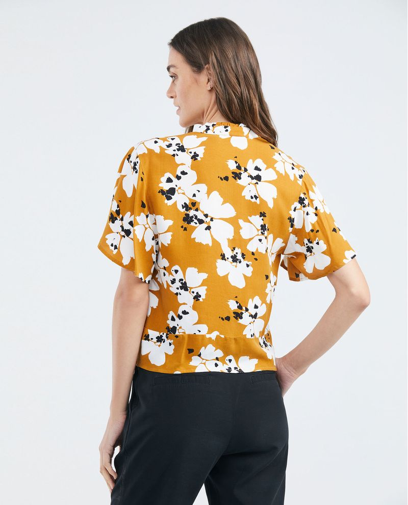 Camisa de Mujer, Silueta Recta Manga Corta con Vuelo Cuello Nerú Escote en V - Maxi Print Flores