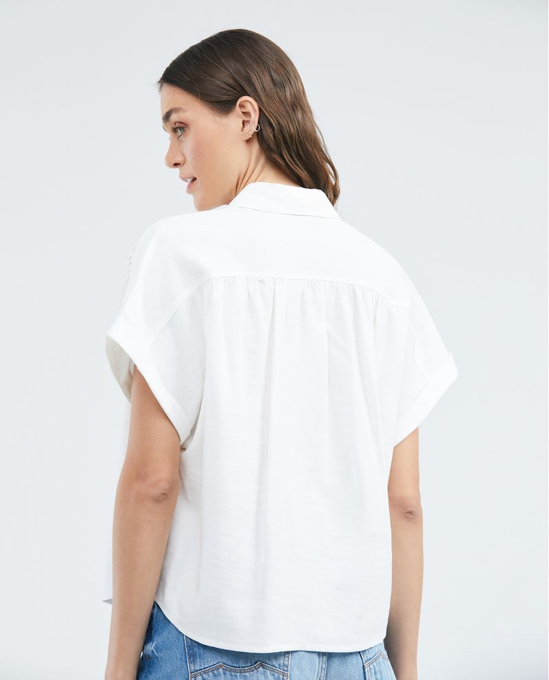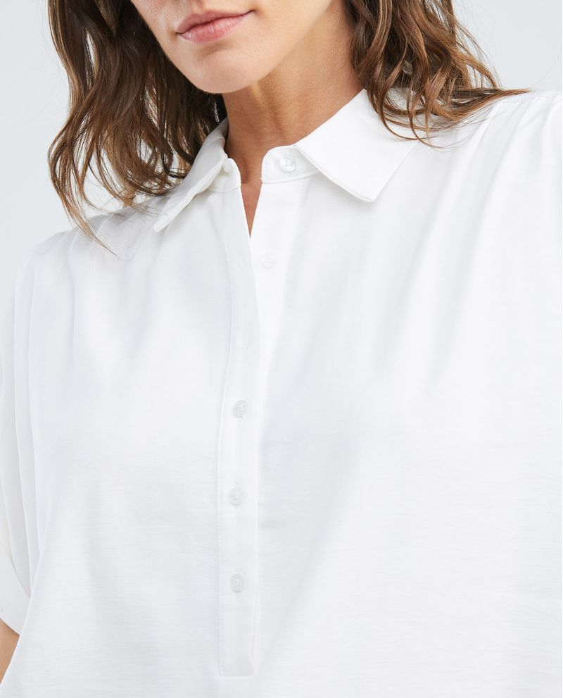Camisa de Mujer, Silueta Recta Manga Corta Hombro Rodado Cuello Camisero - Media Perilla Escote V